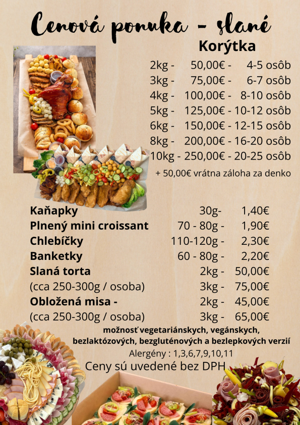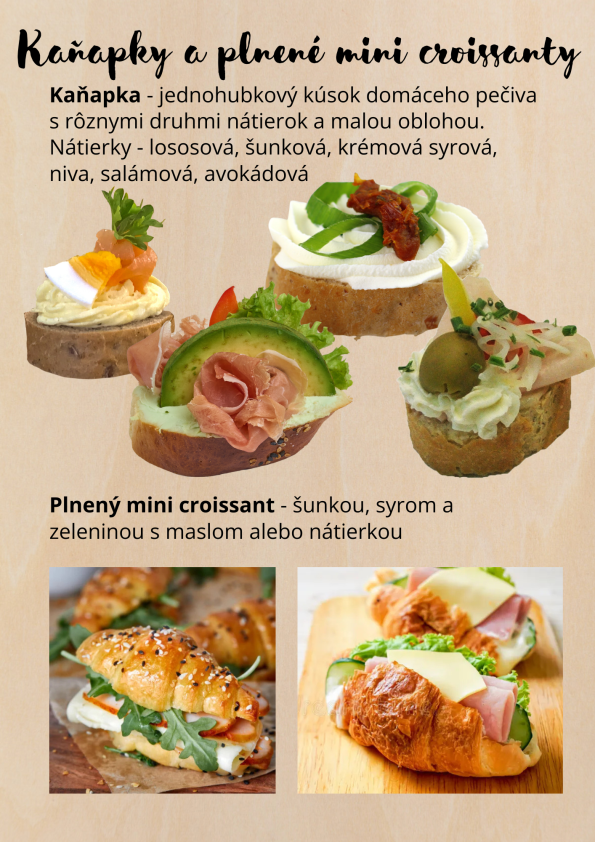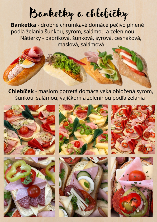 Pripraviť vám vieme korýtka, slané torty, obložené misy, Hankine combo boxy, ale aj chlebíčky, croissanty, banketky a kaňapky.